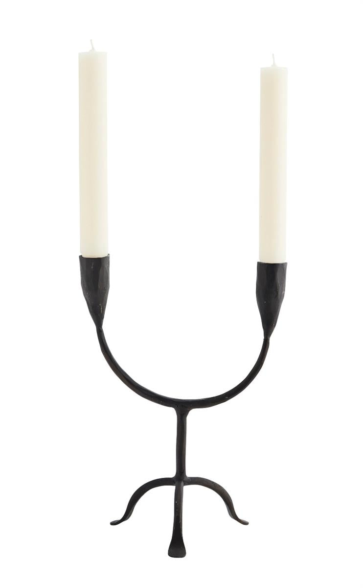 Beautiful hand forged double candle holder crafted from quality metal. Perfect for creating ambient lighting in any room. Artisan-made candle stand from Wooden Horse Homewares. Size is 19x25cms.